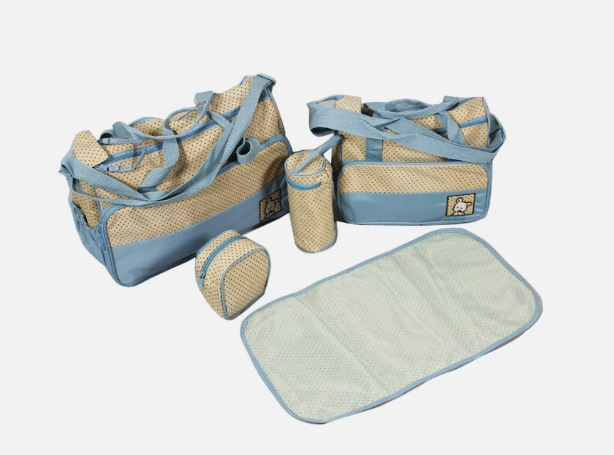Un elegant si practic set de 5 piese de genti pentru maternitate fabricat din poliester de inalta calitate, contine o geanta mare, o geanta medie, o geanta de pranz, o geanta de izolare si o fasa pentru schimbare mata.